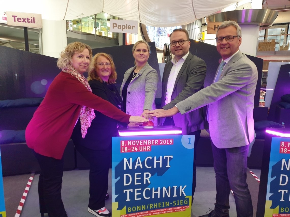 Den Countdown zur 1. Nacht der Technik in Troisdorf aktivierten (v.l.n.r.): Monika Hansen (Mannstaedt GmbH), Sabine Wahl-Braun (Projektleiterin VDI), Daniela Simon (Stadtwerke Trosidorf), Thomas Zacharias (TROWISTA GmbH) und Horst Behr (VDI Bezirksvorsitzender)