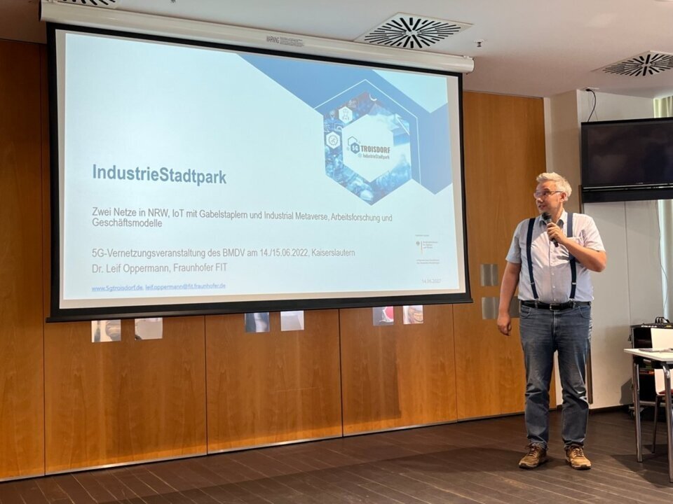 Dr. Leif Oppermann (Fraunhofer FIT) präsentiert das Projekt „5G Troisdorf IndustrieStadtpark“ auf der 5x5G-Vernetzungsveranstaltung des BMDV in Kaiserslautern