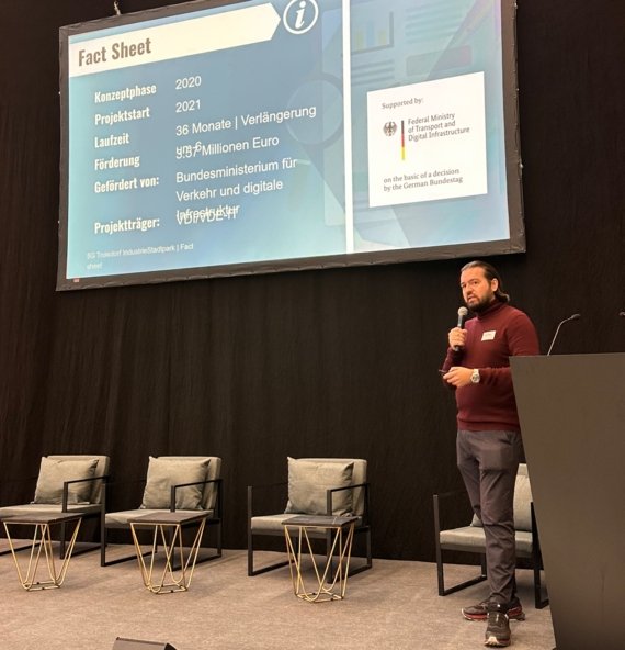 Foto: Alexander Miller (TROWISTA GmbH) stellt das Projekt „5G Troisdorf IndustrieStadtpark“ auf der 5G-Vernetzungs- und Abschlussveranstaltung der SynergieRegion Stuttgart in der Arena 2036 vor.