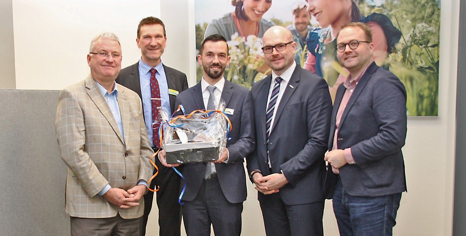 Die Regionalgeschäftsstelle der BARMER ist in die ehemaligen Räumlichkeiten der Deutschen Bank Am Bürgerhaus 10 gezogen. Mit dem Troisdorfer Willkommenspaket – einer Auswahl von kulinarischen Spezialitäten aus Troisdorf – begrüßten Bürgermeister Klaus-Werner Jablonski und TROWISTA-Geschäftsführer Thomas Zacharias den BARMER-Regionalgeschäftsführer Florian Wonneberger und sein Team am neuen Standort.
