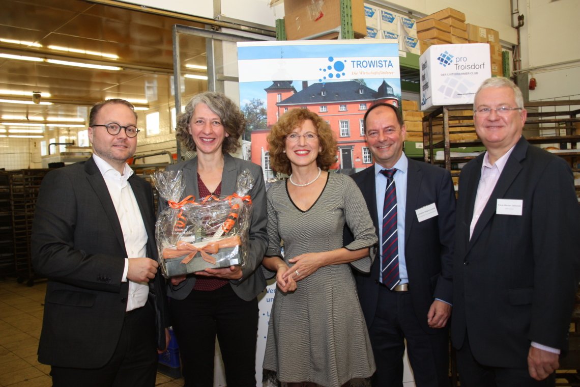In dritter Generation führt die Familienunternehmerin Claudia Eich die Bäckerei Eich, die heute als GmbH & Co. KG firmiert. In ihrer Zentrale in der Mendener Straße in Troisdorf empfing sie am Mittwoch, 27. September, Repräsentanten aus Politik und Wirtschaft zu einem Unternehmer-Frühstück von pro Troisdorf – der Unternehmer-Club und der TROWISTA. Unter den Gästen war auch Bürgermeister Klaus-Werner Jablonski. Warum die Diplom-Sportlehrerin 1991 in den väterlichen Betrieb einstieg und 1996 Geschäftsführende Gesellschafterin wurde? „Weil ich eine geborene Eich bin“, sagt sie im pro Troisdorf-Gespräch. Rund 80 Mitarbeiterinnen und Mitarbeiter beschäftigt Claudia Eich in ihrer Zentrale an der Mendener Straße in Friedrich-Wilhelms-Hütte sowie in 12 Filialen in Troisdorf, Lohmar, Neunkirchen-Seelscheid, Bonn und Hennef. Darunter sind ein Bäckermeister und sieben Gesellen. „Mittelständische Familienunternehmen sind das Rückgrat der Beschäftigung in Deutschland“, betonte pro Troisdorf-Vorstandsvorsitzender Christian Seigerschmidt bei der Veranstaltung. „Und sie sind auch unverzichtbar für die Duale Ausbildung“, setzte er hinzu. Die Bäckerei Eich GmbH & Co. KG bildet derzeit drei Azubis aus. Das Personal und den Nachwuchs sucht Claudia Eich seit 1991 persönlich aus: „Ich habe als Kind in der Backstube gespielt und so alle Abläufe dort miterlebt. Wir haben in der Familie über die Entwicklung des Unternehmens diskutiert. Wer in einem Familienunternehmen groß wird, erwirbt von Kindesbeinen an Managementwissen, das man auf keiner Universität lernen kann.“ „Die Familie Eich steht für traditionelles Handwerk und lokale Verwurzelung. Gesellschaftliches Engagement, Qualitätsbewusstsein und die Kooperation mit der örtlichen Landwirtschaft zeichnen den Betrieb aus“, erklärte Co-Gastgeber Thomas Zacharias, Geschäftsführer der TROWISTA.