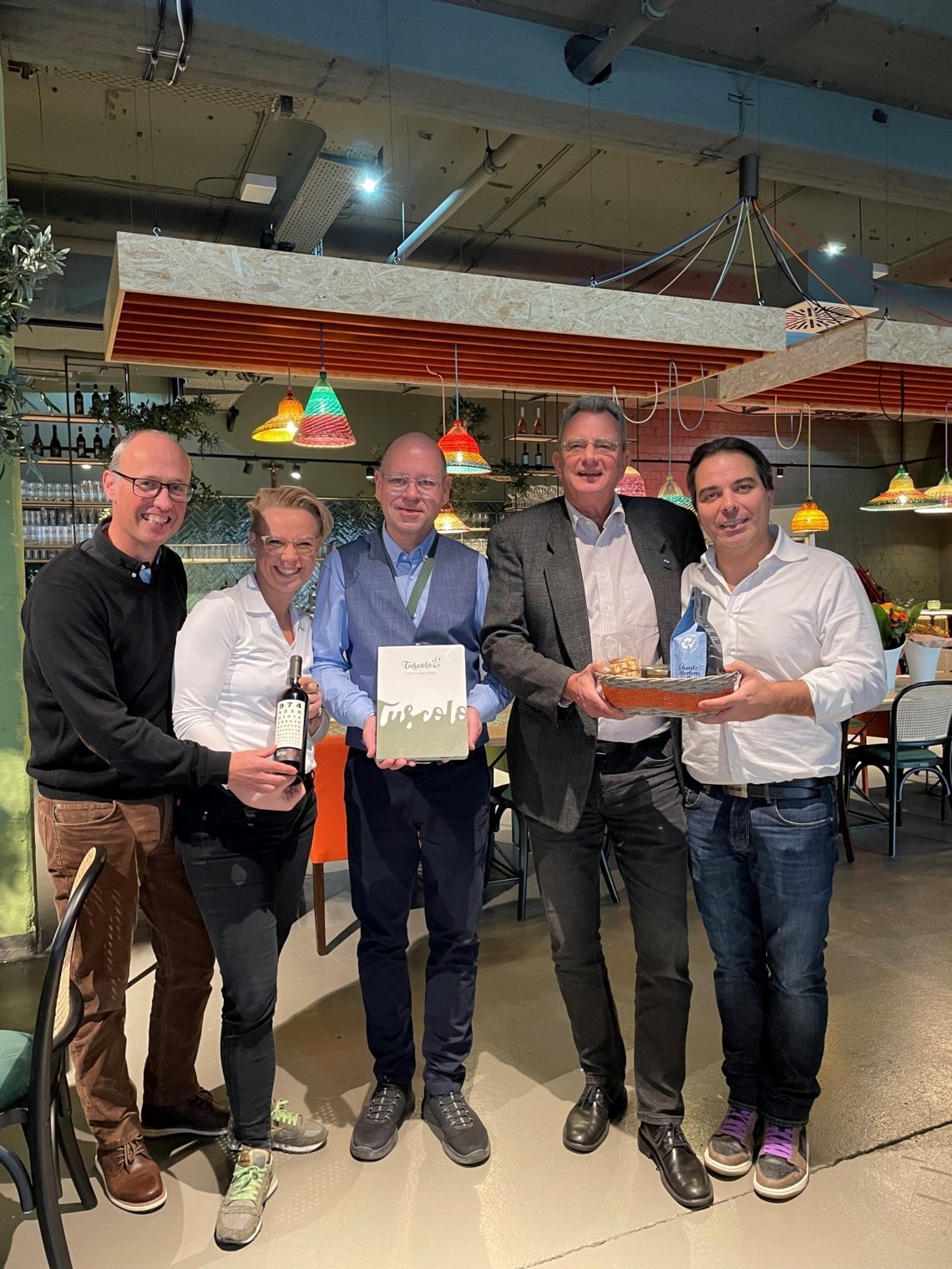 Willkommensgeschenke der TROWISTA zur Eröffnung des Tuscolo in Troisdorf v.l.: Zentrenmanager Stephan Frings (TROWISTA), Betriebsleiterin Felicia Riecke, Restaurantleiter Marcus Neugebauer, TROWISTA-Geschäftsführer Wolf-Dieter Grönwoldt und Tuscolo Geschäftsführer Pietro Esposito.