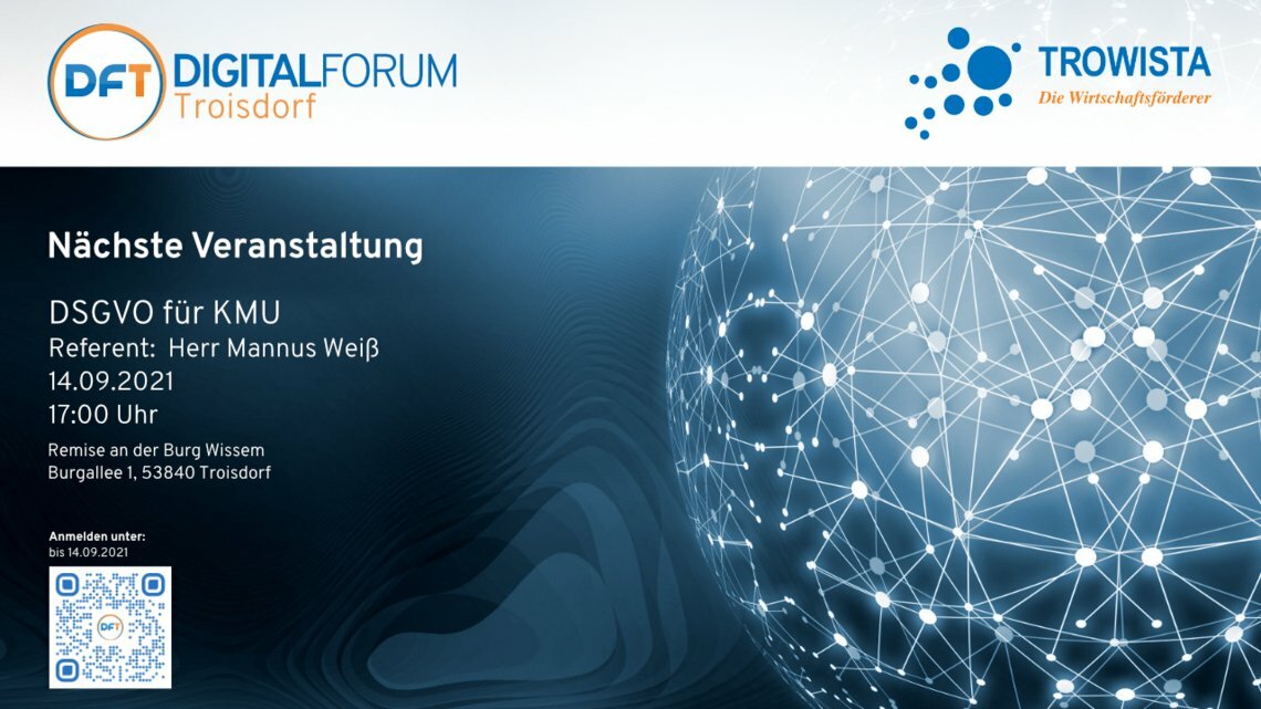 Am Dienstag, den 14. September, von 17:00 bis 19:00 Uhr informiert der Datenschutzexperte Herr Mannus Weiß (https://www.datenschutzkonzept.com/) auf Einladung der TROWISTA, über das Thema DSGVO für KMU. Nachdem bereits zwei Veranstaltungen der Reihe online stattgefunden haben, wird das Event erstmals in Präsenz in der Remise an der Burg Wissem abgehalten.