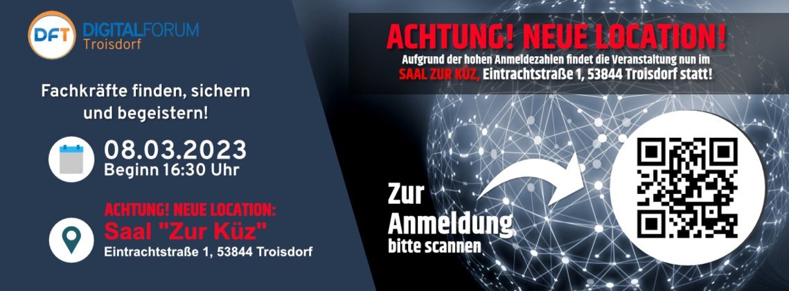 Wenn wir Ihr Interesse als Troisdorfer Unternehmen geweckt haben, möchten wir Sie herzlich einladen, an unserer Veranstaltung teilzunehmen. Die Details zur Veranstaltung entnehmen Sie bitte unseren Terminen unter DigitalForum Troisdorf - Fachkräfte finden, sichern und begeistern.