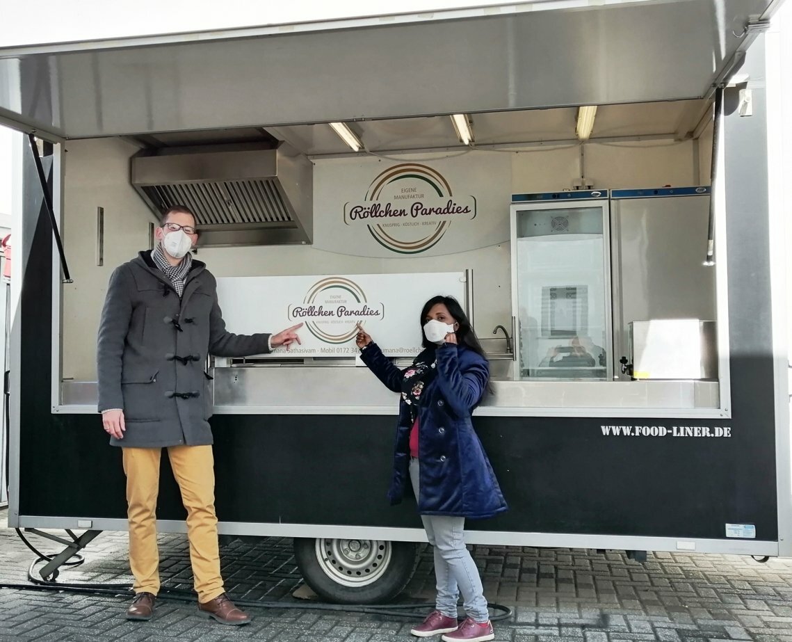 Sumana Sathasivam-Windscheif vor dem Street Food-Trailer mit Wirtschaftsförderer Fabian Wagner