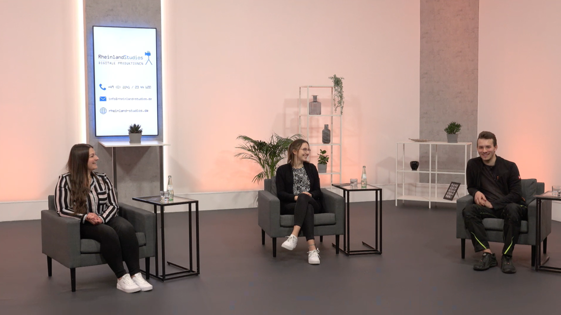 Virtuelle Talkrunde in den RheinlandStudios: (v.l.n.r. Stefanie Klemstein, Selina Maaß und Max Schneider von RheinlandAkustik)