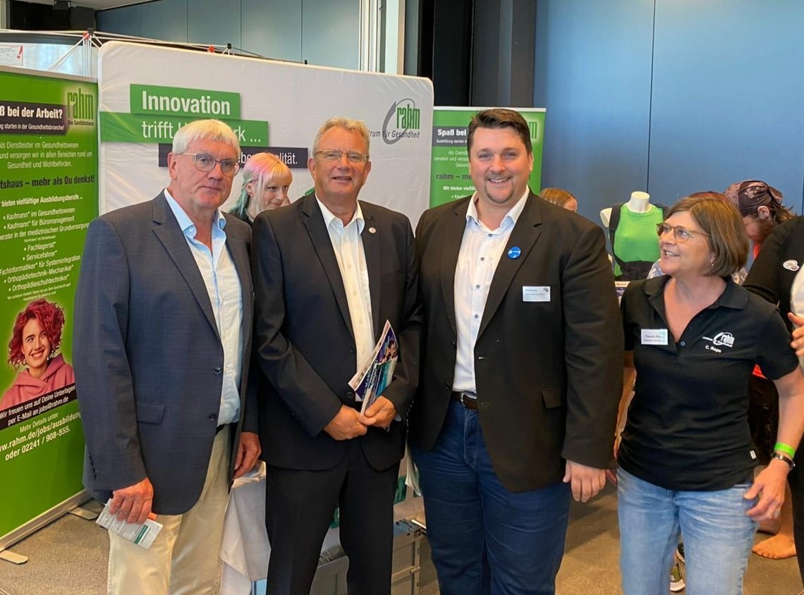 (v.l.n.r.) Landrat Sebastian Schuster, Geschäftsführer der TROWISTA Wolf-Dieter Grönwoldt sowie Bürgermeister Alexander Biber besuchten unter anderem auch den Stand der rahm GmbH.
