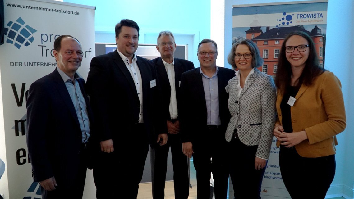 (v.l.n.r.:) Christian Seigerschmidt (pro Troisdorf e. V.), Bürgermeister Alexander Biber, Wolf-Dieter Grönwoldt (TROWISTA GmbH), Eric Schütz (Gerling&Schütz Immobilien- und Beteiligungsgesellschaft mbH), Landesbauministerin Ina Scharrenbach und Landtagsabgeordnete Katharina Gebauer.