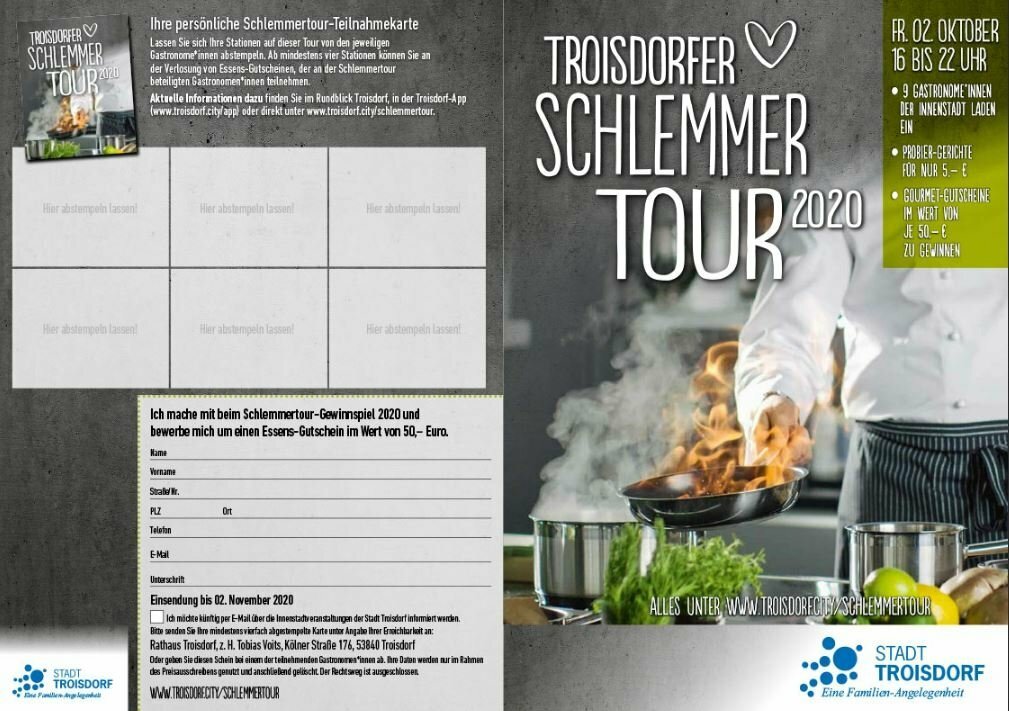 Wegen Corona konnte die Schlemmertour dieses Jahr nicht wie gewohnt im Frühjahr stattfinden. Aber die Stadt Troisdorf, die teilnehmenden Gastronomen und viele Bürgerinnen und Bürger möchten auf dieses erfolgreiche Event nicht verzichten. Neun Troisdorfer Gastronomie-Betriebe präsentieren sich und ihr schmackhaftes Angebot deshalb