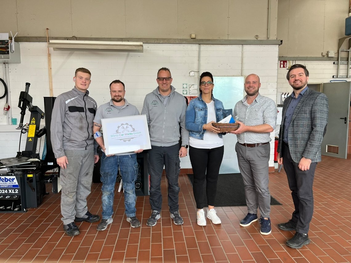 In der Werkstatt der Wörtz Car-Works GmbH überreichen TROWISTA-Geschäftsführer Alexander Miller (r.) und Wirtschaftsförderer Tobias Voits (2. v. r.) ein Willkommenspräsent an Geschäftsführer Christian Wörtz und seine Ehefrau Sandra (Mitte). Ebenfalls im Bild: Praktikant Nico (1.v.l.) und KFZ-Mechatroniker