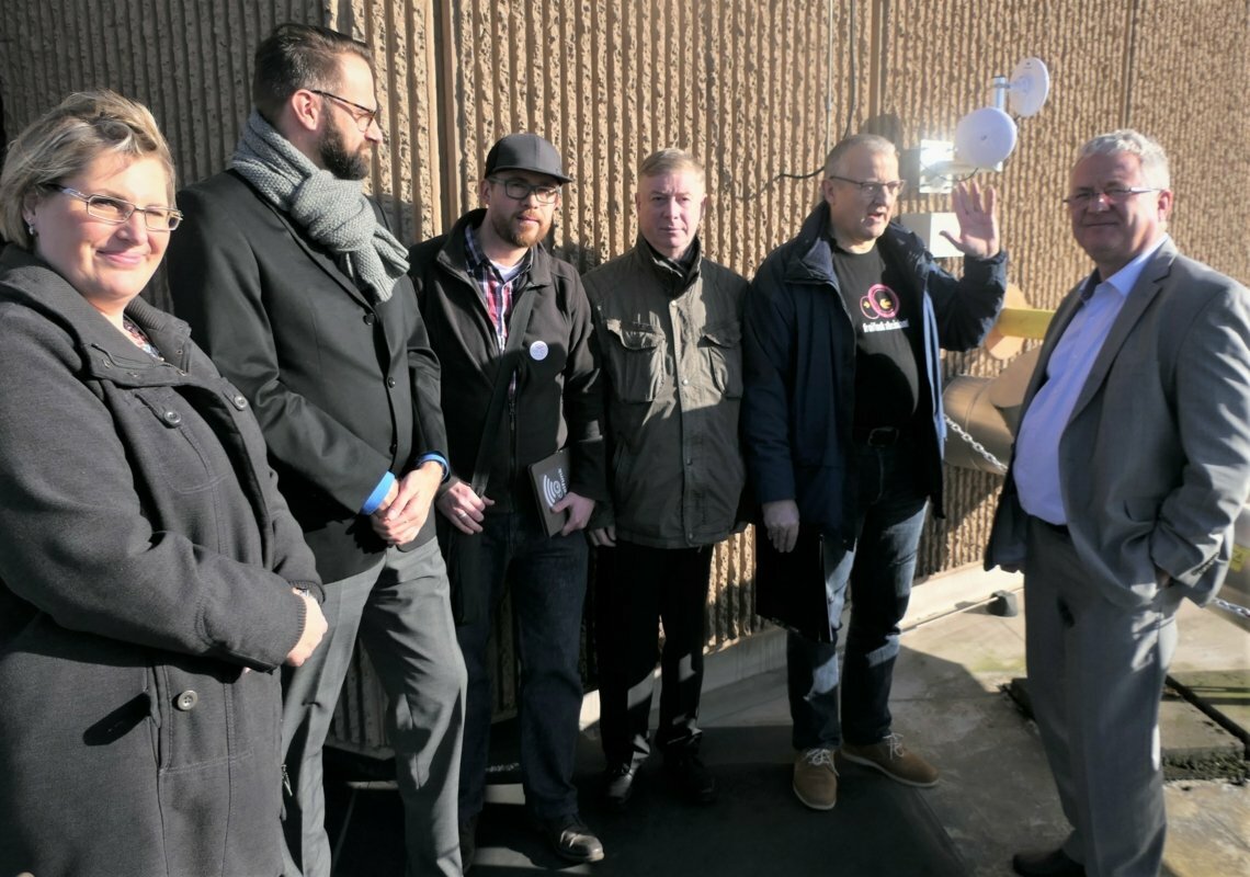Neue Anlagen auf dem Rathaus-Dach: Sandra Hildebrandt und Andreas Dellbrügge (Stadtverwaltung), Andreas Kurm, Alexander Volodarski und Andreas Groß (Freifunk Rhein-Sieg) und Bürgermeister Klaus-Werner Jablonski (v.l.).