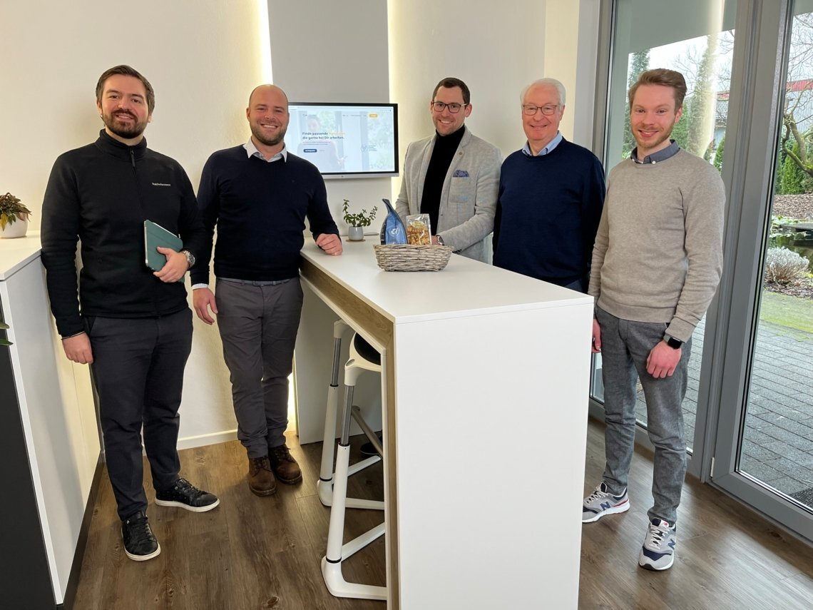 v.l.n.r.: Alexander Miller und Tobias Voits (TROWISTA) überreichen Maximilian Haas, Dietmar und Patrick Schwarz (/TUN Gruppe) das TROWISTA-Willkommenspaket.