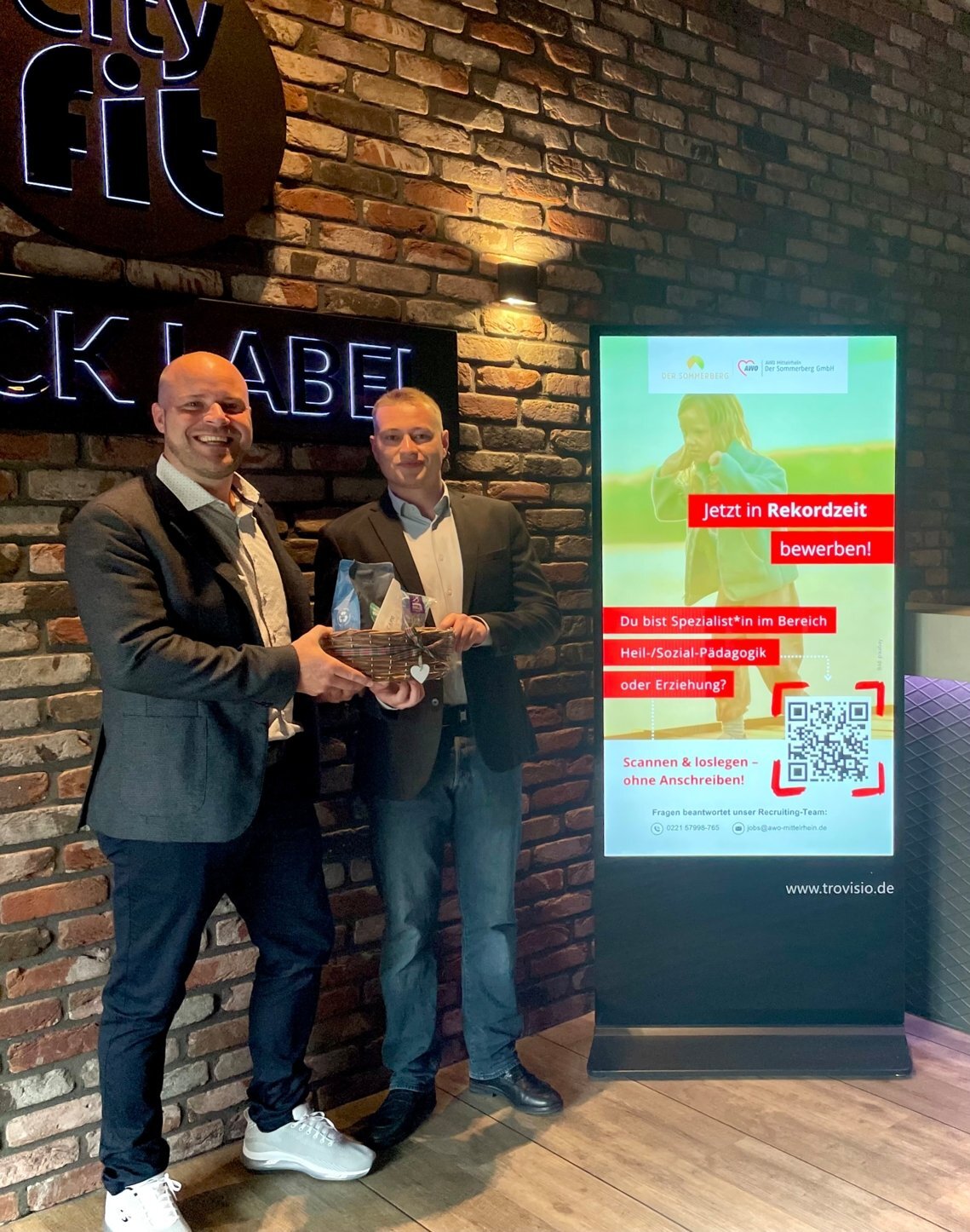 Bei der Übergabe eines kleinen Präsentkorbes stellte troviso-Geschäftsführer Robin Willgerodt (r.) Wirtschaftsförder Tobias Voits (l.) die neue Display-Stele im CityFit Spich vor.