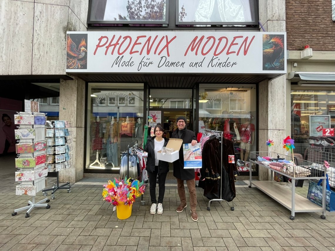 Zentrenmanager Stephan Frings überreicht ein Starterpaket an Phoenix Moden.