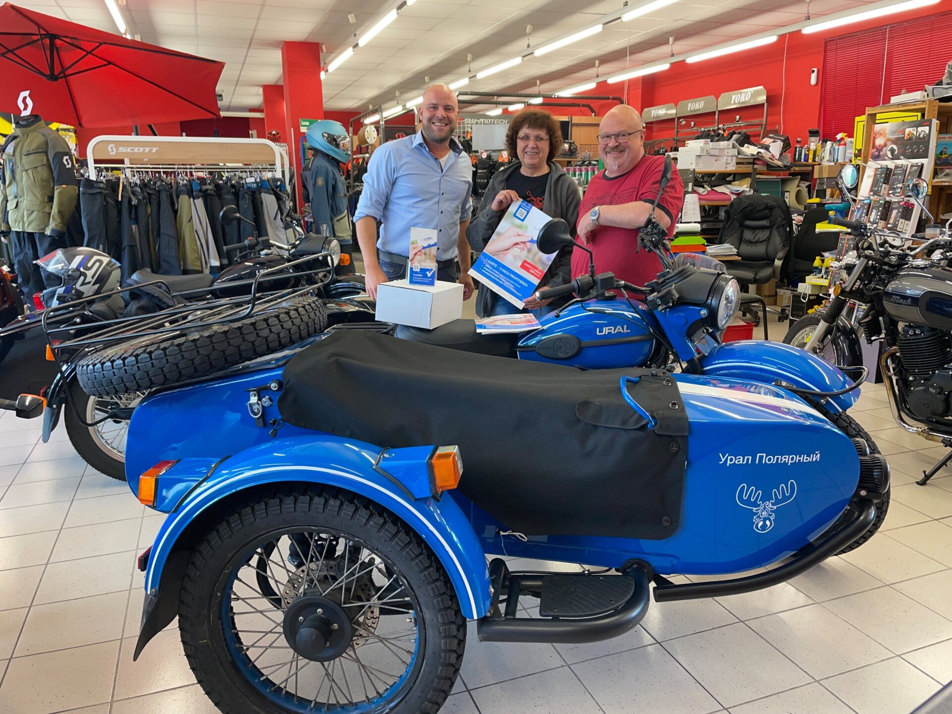 Wirtschaftsförderer Tobias Voits übergibt das Starterpaket an Motcom in Troisdorf Altenrath. Die TroCARD-Familie wächst stetig, immer mehr Gewerbetreibende kommen mit an Bord.