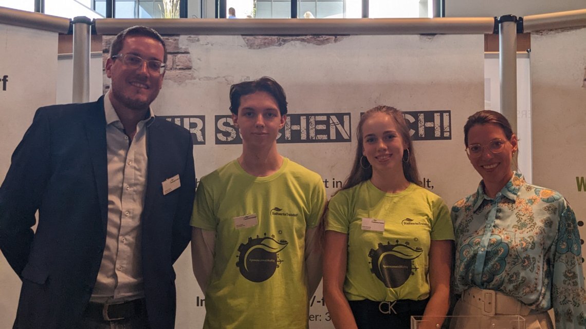 v.l.n.r.: Ausbildungsleiter der Stadtwerke Troisdorf GmbH, Thomas Disch, die Auszubildenen der Stadtwerke Troisdorf GmbH Tim Runkel und Sarah Schmitz und Wirtschaftsförderin der TROWISTA, Miriam Grüters