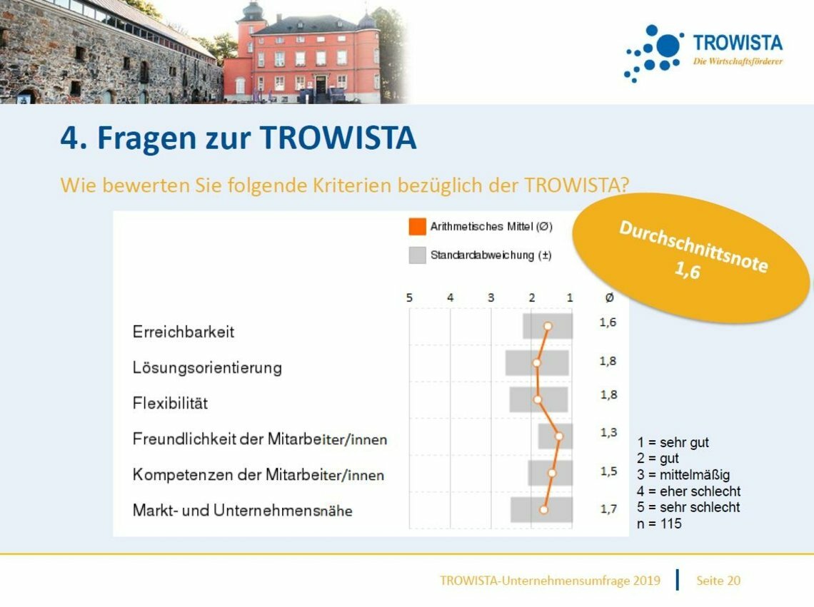 Mit einer glatten 2,0 bewerteten Troisdorfer Unternehmen ihren Wirtschaftsstandort. In einer Umfrage der Wirtschaftsförderungsgesellschaft TROWISTA wurden 778 Unternehmensvertreter u.a. um die Bewertung des Standortes gebeten, von denen sich 124 an der Befragung beteiligten.