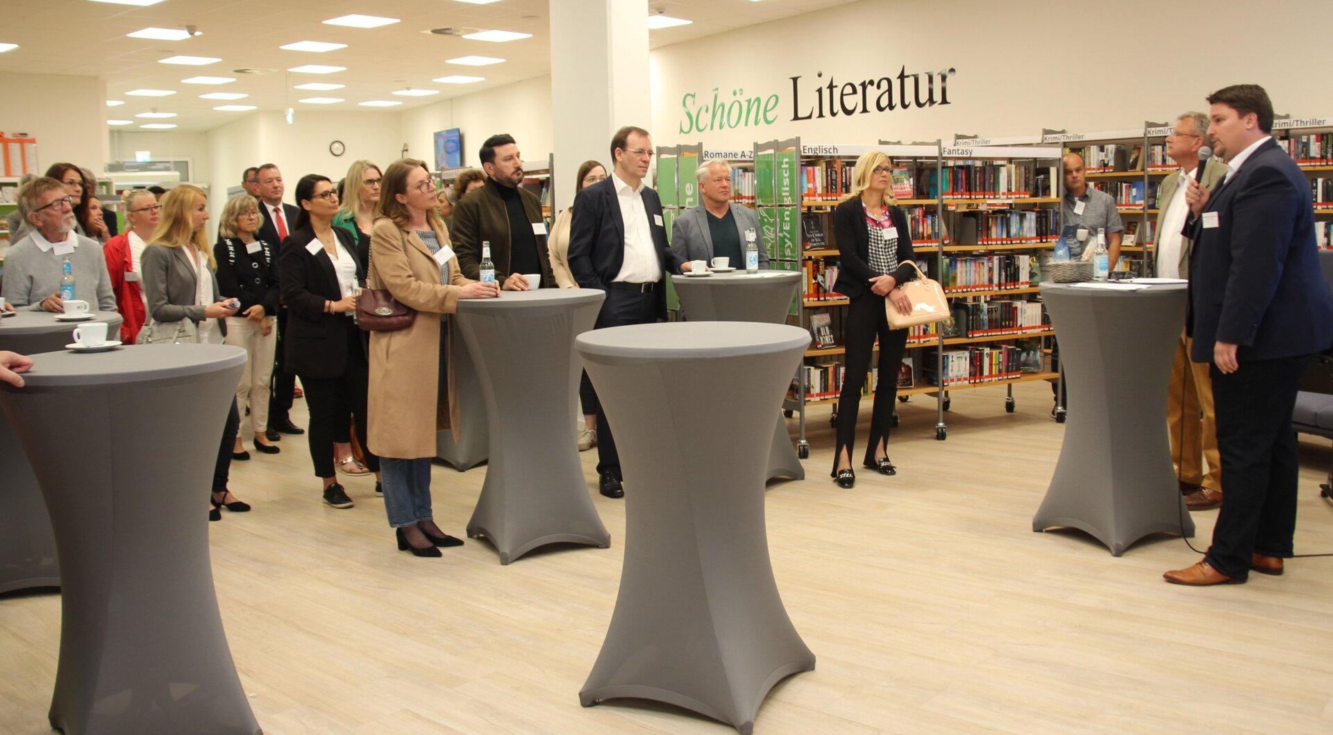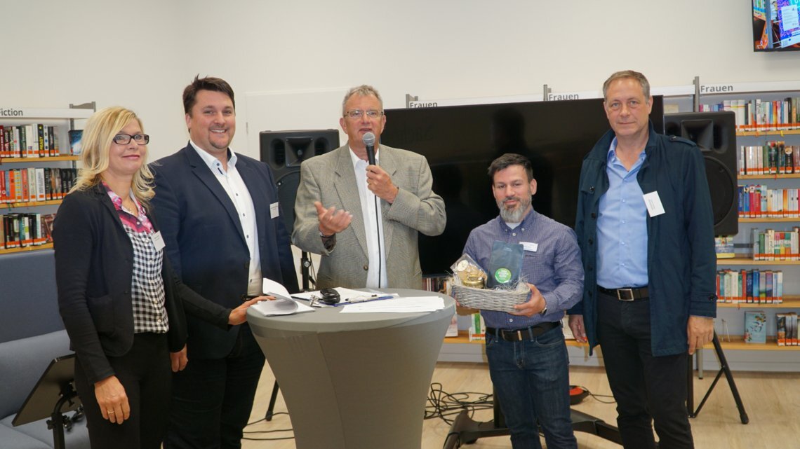 (v.l.n.r.: Stephanie Orefice (Troisdorf Aktiv e.V., Bürgermeister Alexander Biber, Wolf-Dieter Grönwoldt (TROWISTA), Philipp Maaß (Stadtbibliothek), Dirk Pohlscheidt (Troisdorf Aktiv e.V.)