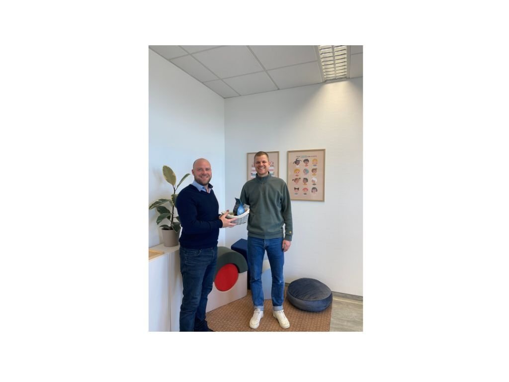 Wirtschaftsförderer Tobias Voits (li) überreicht Lerncoach Vincent Schulte-Kellinghaus (re) ein kleines Willkommenskörbchen mit regionalen Produkten.
