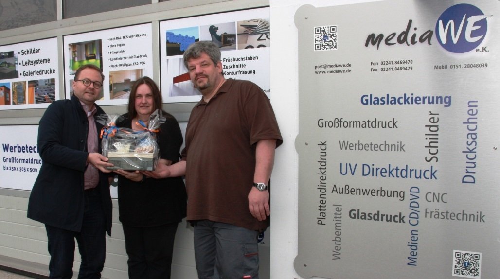 Wirtschaftsförderer Thomas Zacharias hieß die Eheleute Weber herzlich willkommen: „Wirtschaftliche Überlegungen und private Präferenzen haben Sie zum Umzug nach Troisdorf veranlasst. Es bestätigt, dass die Stadt attraktiver Wirtschaftsstandort und Wohlfühlstandort gleichermaßen ist.“