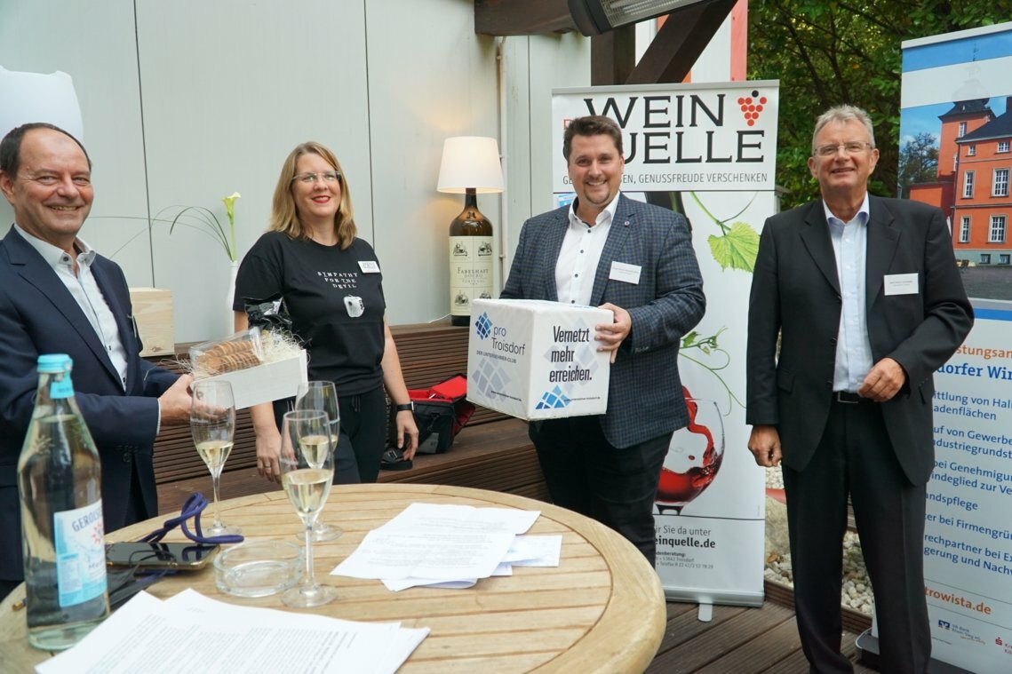 (v.l.n.r. Christian Seigerschmidt (pro Troisdorf), Susanne Nußbaum (Die Weinquelle), Bürgermeister Alexander Biber, Wolf-Dieter Grönwoldt (TROWISTA)