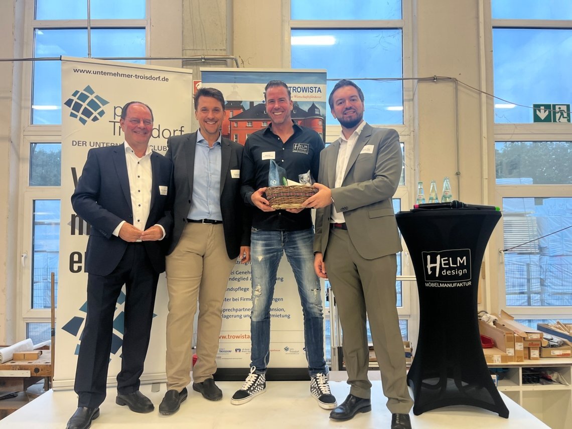 (v.l.n.r) Vorstandsvorsitzender des Unternehmerclubs pro Troisdorf e.V. Christian Seigerschmidt, Bürgermeister Alexander Biber, Gründer und Geschäftsführer der Helm Einrichtung GmbH Daniel Helm, TROWISTA-Geschäftsführer Alexander Miller