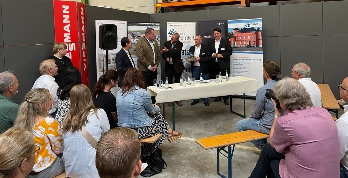 Lieferunsicherheiten beim Gas: Rückkehr zum Öl, Wärmepumpen plus Photovoltaik, Biomasse als Energielieferant? Die Frage nach einer krisensicheren Heizungslösung bewegt aktuell Unternehmen und Privathaushalte gleichermaßen. Sie war eins der zentralen Themen beim Unternehmerfrühstück des Unternehmer-Clubs pro Troisdorf und der Wirtschaftsförderungsgesellschaft TROWISTA am 18. August in der Viessmann-Niederlassung Köln-Bonn, Josef-Kitz-Straße.