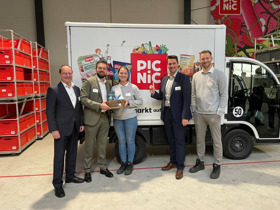 (v.l.n.r) Vorstandsvorsitzender des Unternehmerclubs pro Troisdorf e.V. Christian Seigerschmidt, TROWISTA-Geschäftsführer Alexander Miller, Standortleiterin Luisa True, Bürgermeister Alexander Biber sowie Picnic-Regionalleiter Konstantin Düngen.