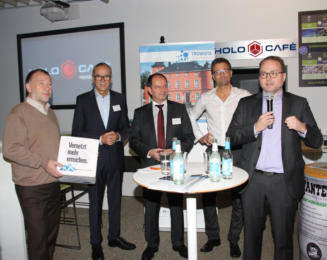 Lasertag, das inzwischen in rund 330 Hallen deutschlandweit gespielt wird und sich wachsender Beliebtheit erfreut, funktioniert ähnlich wie Paintball. Allerdings wird hier nicht mit Projektilen sondern mit ungefährlichen Infrarotstrahlen in abgedunkelten Hindernisparcours auf die leuchtenden Westen anderer Mitspieler geschossen und so Punkte gesammelt.Im Holocafé tragen die Spieler Virtual Reality (VR)-Brillen, die sie in eine virtuelle Welt versetzen, in der sie sich dann in Gestalt von Fantasiefiguren bewegen können. Die FUNSPORTS AREA GMBH war erster Franchisenehmer dieses virtuellen Spiels in Deutschland. TROWISTA-Chef Thomas Zacharias beim Unternehmer-Frühstück: „Virtual Reality ist ein Megatrend, der nahezu alle Branchen erfasst – auch die Freizeitwirtschaft. Ich freue mich, dass Aue Troisdorf als ersten Standort für das Holocafé gewählt hat.“