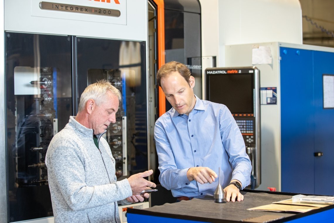Heiko Overath (links) bespricht mit Dr. Patrick Weiß die Auswahl des geeigneten Fräskopfes für ein Bauteil (Foto: Rainer Hardtke)