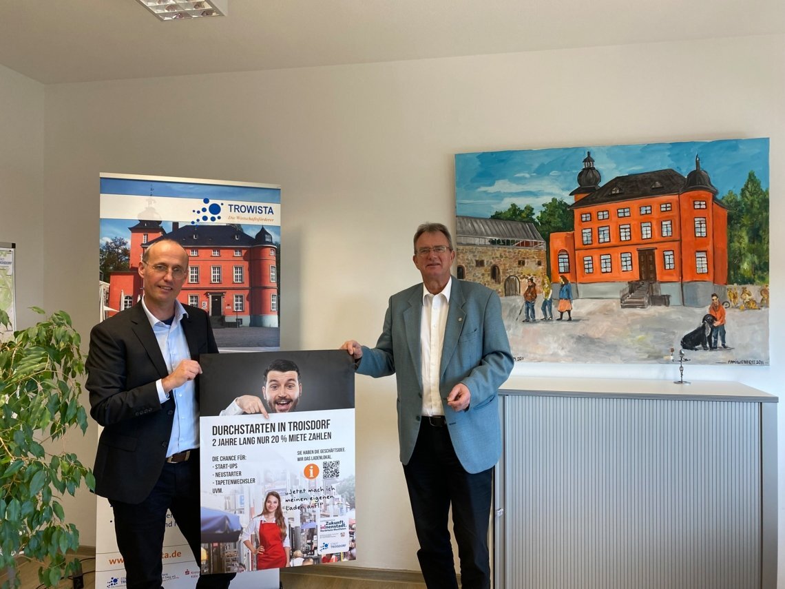 TROWISTA-Geschäftsführer Wolf-Dieter Groenwoldt (r.) und TROWISTA Projektmanager Stephan Frings präsentieren das "Durchstarten in Troisdorf"-Plakat als einen Bestandteil der Marketingkampagne für das Förderprogramm zur Stärkung unserer Innenstädte und Zentren