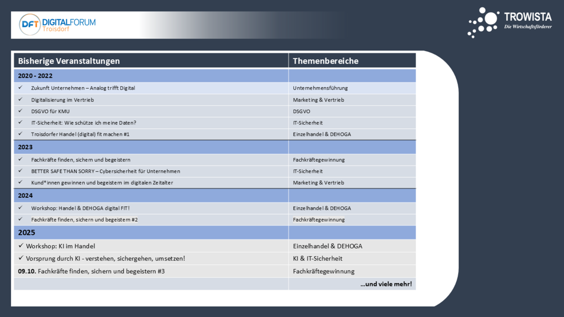 Mit dem DigitalForum Troisdorf hat die TROWISTA Ende 2020 eine Veranstaltungsreihe ins Leben gerufen, die das oft genutzte "Buzzword" Digitalisierung in konkrete Themen für Unternehmer*innen herunterbricht. In Form von kurzweiligen Präsentationen, Workshops, Webinaren und weiteren Formaten beleuchten Digitalexperten der Region ganz unterschiedliche Aspekte der Digitalisierung.
