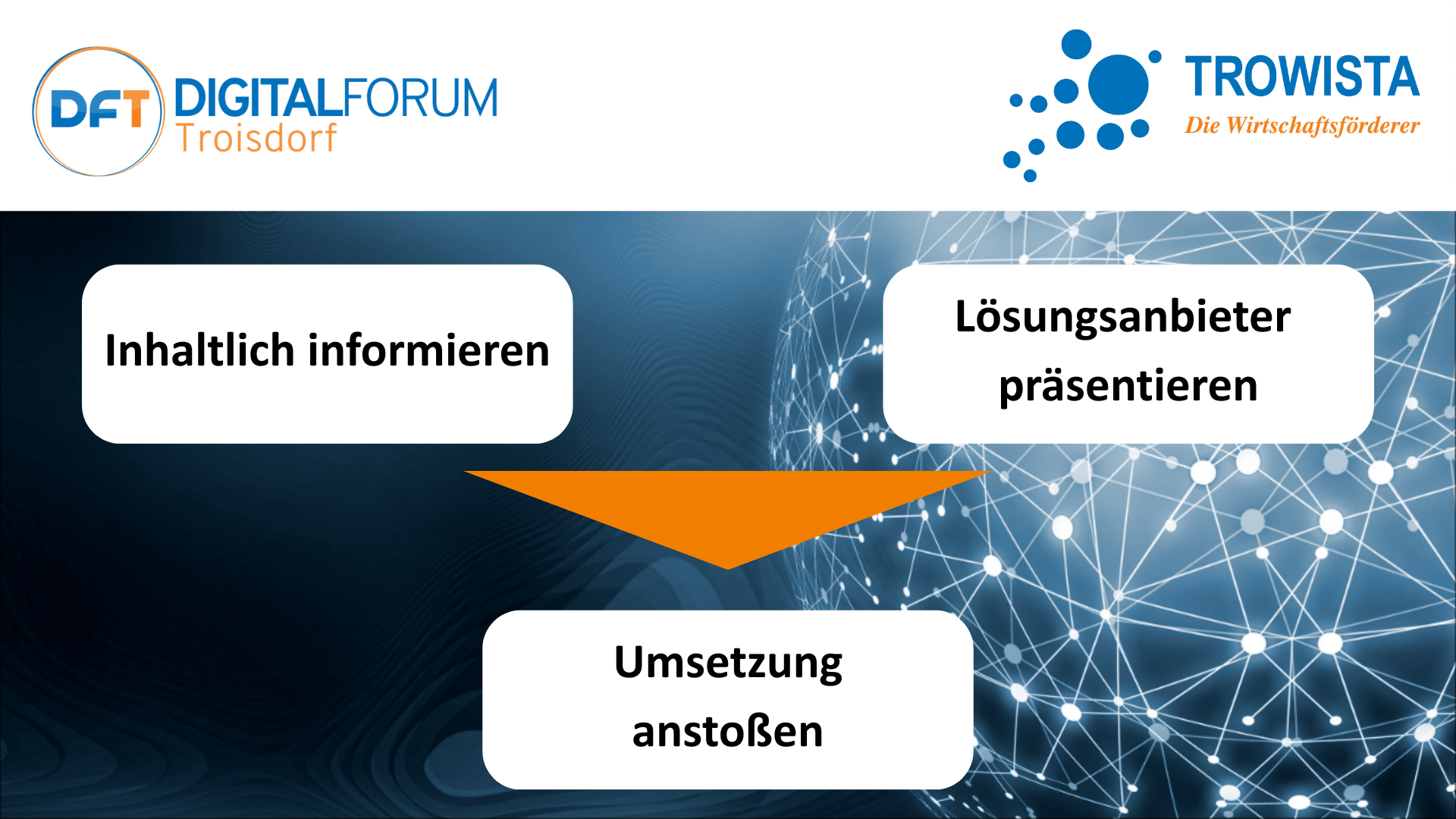 Ein besonderer Fokus liegt dabei auf der Vernetzung von Troisdorfer Unternehmen mit den entsprechenden Lösungsanbietern und Dienstleistern, um konkrete Projekte anzustoßen und umzusetzen.