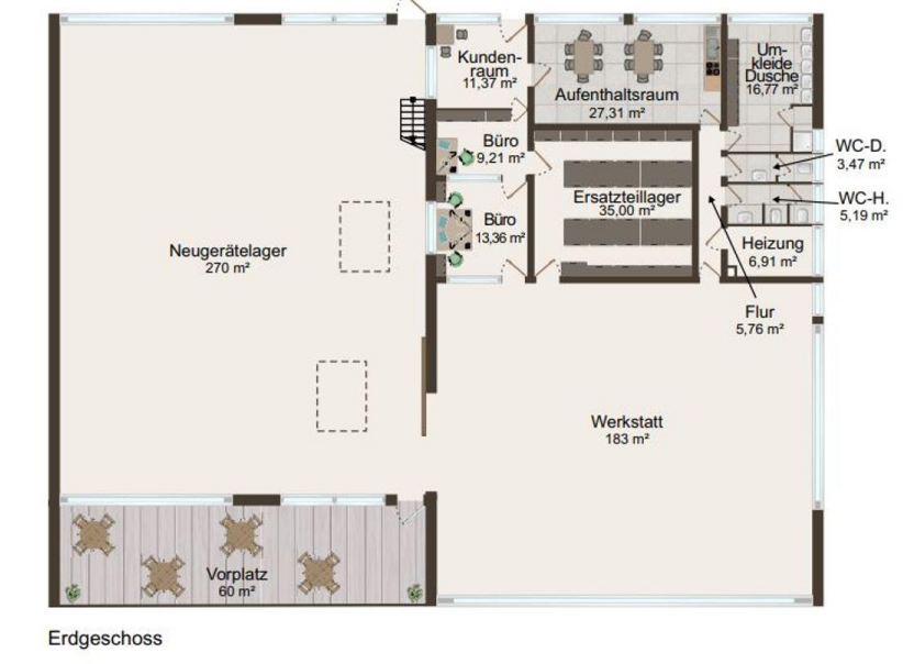 Alternativ kann das Objekt auch mit einer reduzierten Freifläche angemietet werden. In diesem Fall beträgt die monatliche Miete 11.200,00 €.