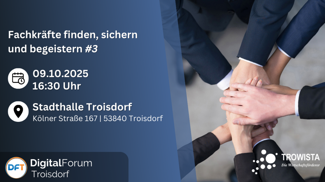 Genau hier setzt das DigitalForum Troisdorf an. Gemeinsam gehen wir mit Ihnen in die dritte Runde unserer Reihe „Fachkräfte finden, sichern und begeistern“ – mit Impulsen, die Mut machen, neue Perspektiven eröffnen und konkrete Lösungsansätze bieten.