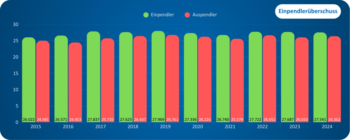 Troisdorf hatte im Jahr 2024 bei 27.541 Einpendlern, einen Einpendlerüberschuss von 1.179. (Quelle: IT.NRW)