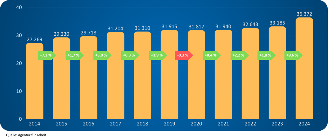 Im Jahr 2024 gab es in Troisdorf insgesamt 36.372 Sozialversicherungspflichtig Beschäftigte (Quelle: Agentur für Arbeit)