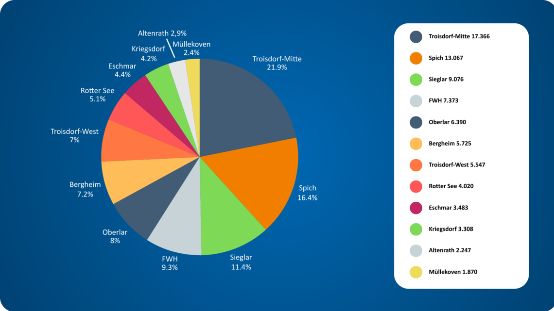 Zum Stichtag 01.01.2024 zählte die Stadt Troisdorf 79.472 Einwohner. (Quelle: Stadt Troisdorf)