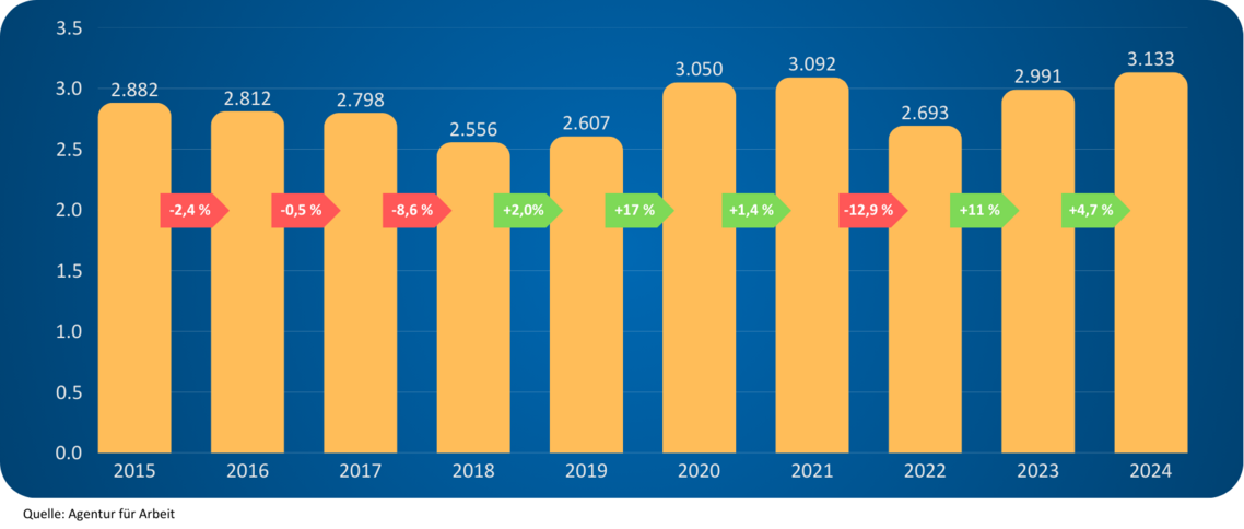 Der Jahresdurchschnitt der Arbeitslosen im Jahr 2024 lag in Troisdorf bei 3.133. (Quelle: Agentur für Arbeit)